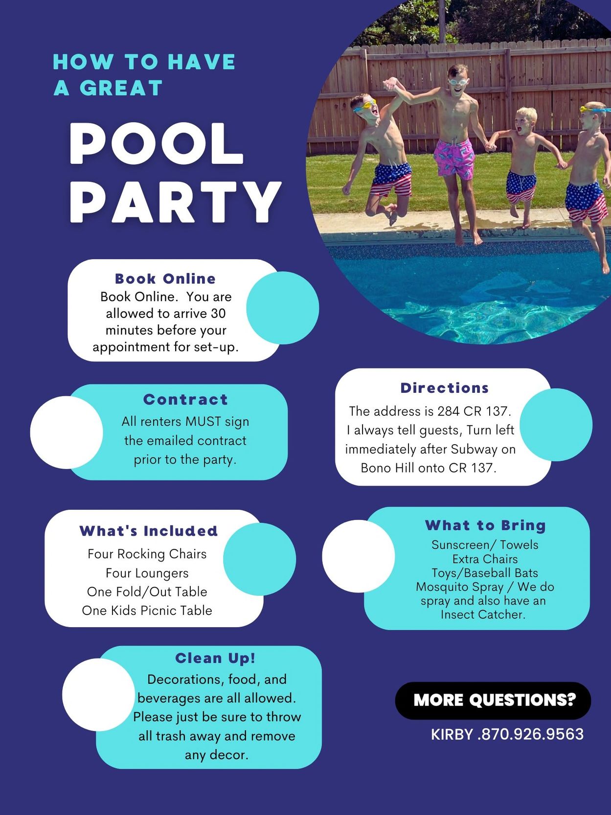 We appreciate your business and hope you had a great party! We ask you throw all trash in the large dumpster and place all furniture back in its original place. We hope you use the pool again!